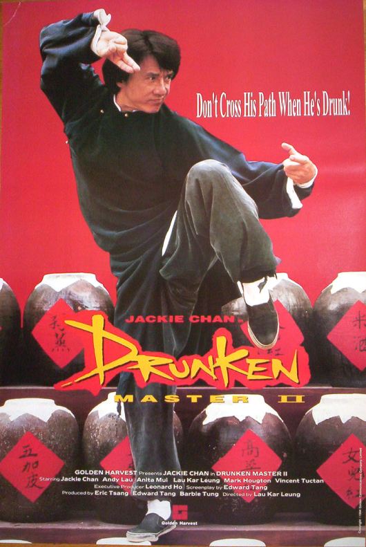 So, halfway through the film, when Jet Li’s mysterious monk character steals the macguffin staff from our main hero, Jackie’s drunken immortal goes in to get it back, and awesome ensues.