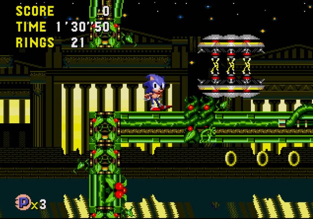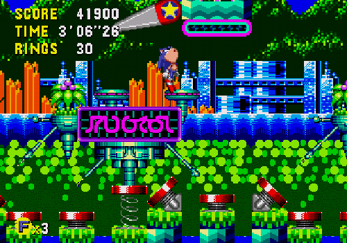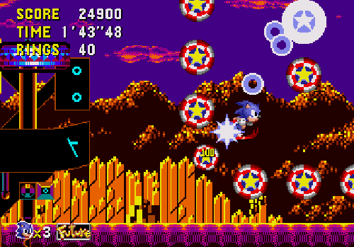 As for the main attraction, it’s a very mixed bag. The first playthrough was miserable, I played through like anybody new to the game would, hitting every time-travel sign and warping whenever a sudden obstruction wouldn’t kill my flow, without rhyme or reason but to enjoy constantly shifting through time. Playing this way, I got pissed frequently because there are too many sudden obstructions and very few places to pick up enough speed unless you know the level well. As a beginner just trying to have a little fun running around, more time was spent either taking a hit or running into a concealed spring/wall. They even have springs that go backward for the unsuspecting player. It becomes a problem when it feels like Sonic is out of your control as in Collision Chaos and Wacky Workbench, my two least favorite levels where most of my time was spent helplessly bouncing wherever the bumpers would take me. It seems like the environment likes to force Sonic in some instances more than you have free control.