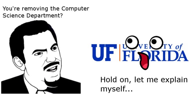 So let me paint you a picture here. The University of Florida is the flagship college for Florida. Anyone who lives in Florida (and/or doesn’t have the budget to leave the state) will try to get into the college. Since a boatload of people will be going there, you’ll cater to the needs of the students by offering many programs. One program that is in high demand is Computer Science. That has become the sort-of standard for colleges in the U.S. If there is a college, there is a Computer Science major. It’s an essential major, like having wheels on a car. So what does UF do to save money? Oh, cut one of the most important majors from its school instead finding a better solution to save money. Yeah, pretty boneheaded if you ask me. And what about the current students within the major who aren’t graduating yet? What are they gonna do now, get grandfathered into some backwater useless major? Think things through people!