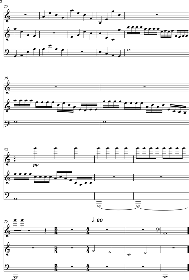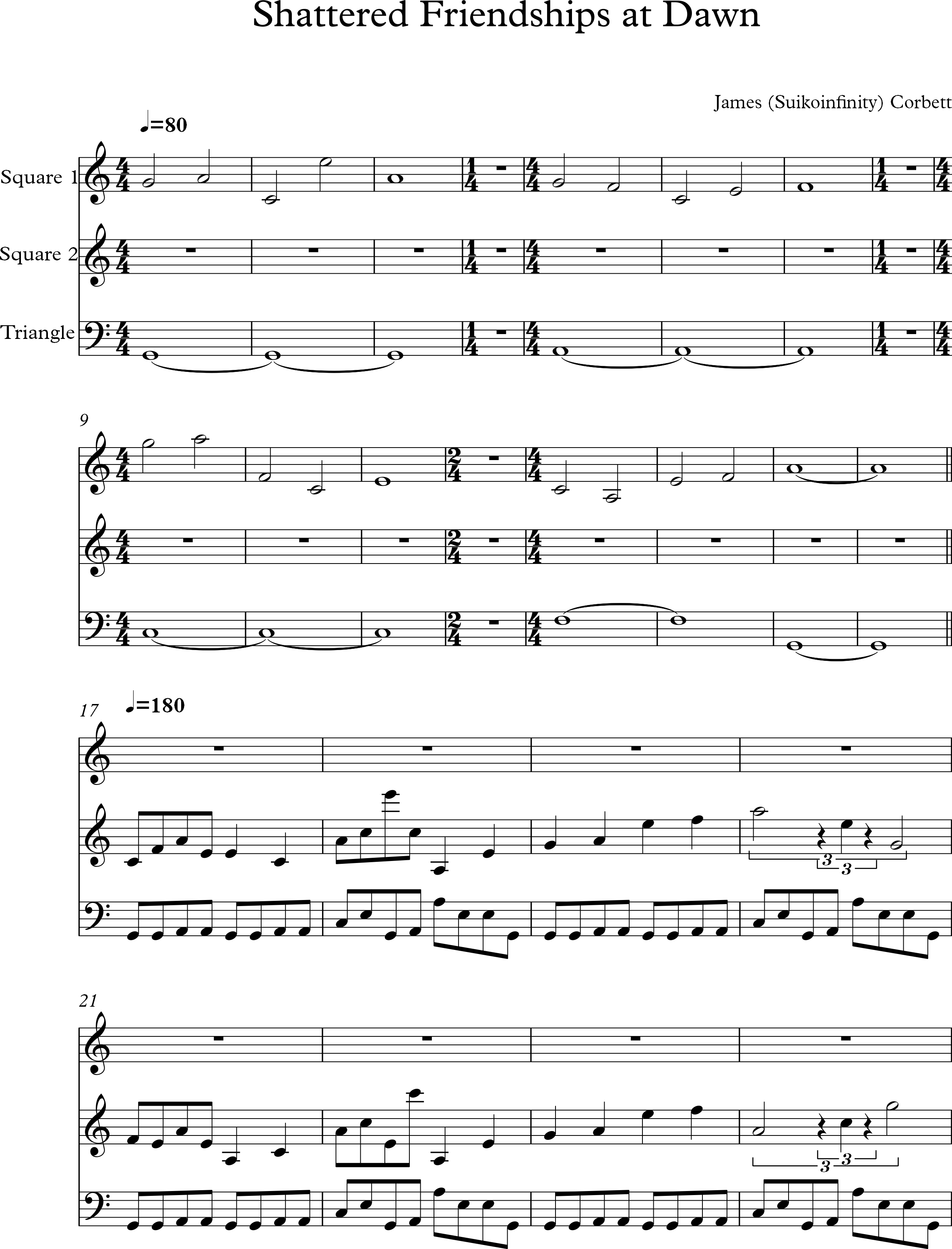 Here’s the transcript for the second Rapid Composition exercise where I again work with an 8-bit style, restricting myself to just two square channels and one for triangle. The notation is probably sloppy as all hell, but remember that this was written in 90 minutes. Also, I encourage anybody interested in composition to join in : the only things I want to have provided for the article are a link to the music, preferably something I can embed like Soundcloud and some visible notation, whether it’s done on traditional score, box notation or whatever.