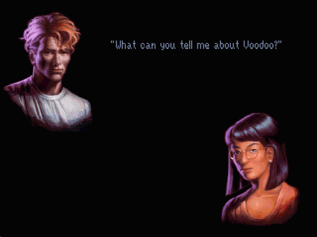 Voice acting was the first thing that struck me when starting the game, and my first impression was that it’s terrible. Later I found out that Gabriel is voiced by Tim Curry and his best friend by Mark Hamill. There is a lot of dialogue, either spoken by one of the characters or a mysterious female narrator. It was hard at first to take some of these voices seriously, but after getting into it, even the voices take on an unexpected charm and when combined with the music and visuals. It’s almost like Police Quest, taking place (mostly) in an urban American city with a theme of crime investigation. Of course, Police Quest always felt a little more rigid and too focused on feeling “Policey” by calling code numbers and following the right protocol, Gabriel Knight in contrast is more laid back and typically lets you screw around without fear of a game over situation.