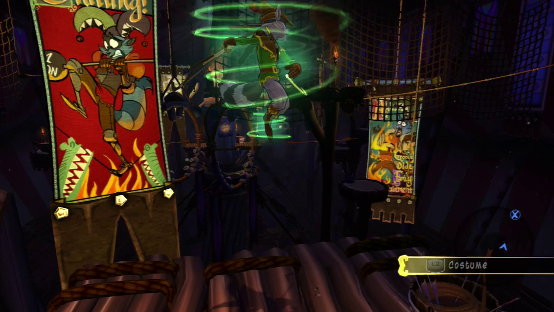 Sly has been known to use a costume here and there, but they now have a direct influence on gameplay. For the demo, we’re able to become an archer, who has the ability to shoot arrows with an attached rope. There are also small targets that the arrows embed into, allowing passage to the next area. One cool feature is that an arrow can be controlled mid-flight, a necessity when the targets begin to move or projectiles are fired along the path.