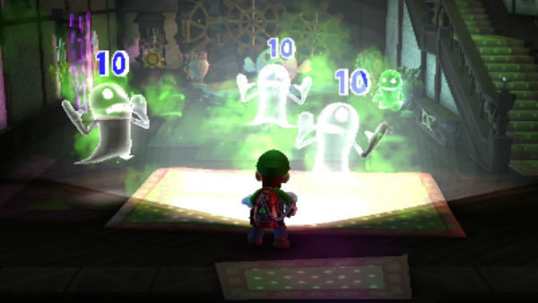 From a functional standpoint, Dark Moon plays much like its Gamecube predecessor. You walk Luigi around a mansion, with only your Poltergust ghost-trapper, your flashlight and your wits to protect you. When you do find a room or environment with ghosts in it, you hit them with a burst of light from your little flasher to stun them (separate from the original, where one need keep the beam focused on the ghosts for an amount of time in order to make them vulnerable), and then suck them up.